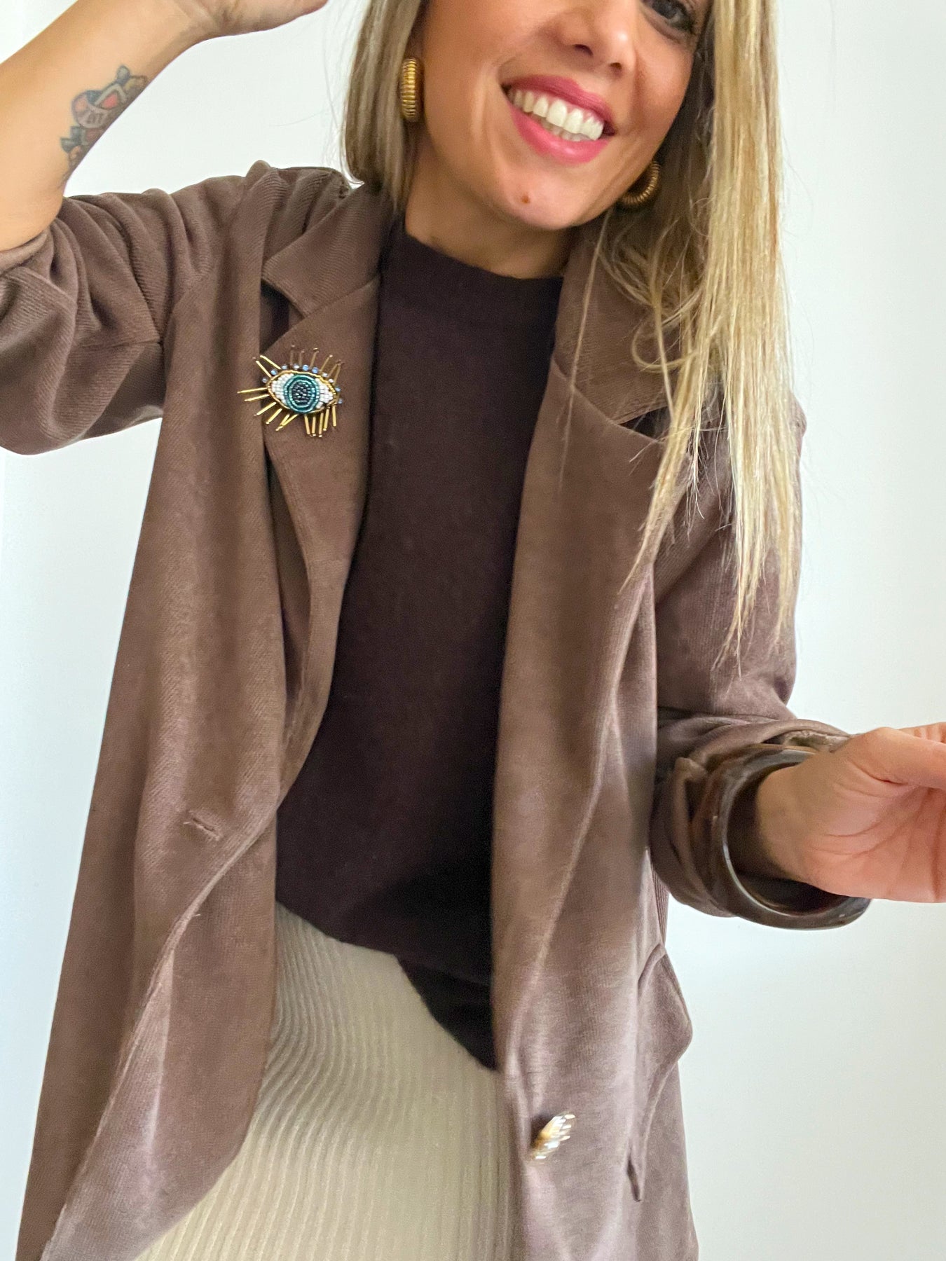 · Blazer efecto Micro pana, ligera y súper suave. Caída fluida, tono marrón chocolate y botón joya que aporta un toque especial. Perfecta para elevar cualquier look del día a día con estilo y comodidad. Detalle de parche Ojo strass super especial, puede quitar o ponerse.